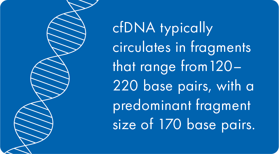 What are the basics of cell-free DNA biology? In healthy individuals, most cfDNA comes from cells of hematopoietic origin (1), primarily through DNA shedding during apoptosis. cfDNA of apoptotic origin typically circulates in fragments ranging of 120–220 base pairs (bp), with a predominant fragment size of around 166–170 bp. This corresponds to the length of DNA that can wrap around a nucleosome (147 bp), plus an additional stretch of DNA to link two nucleosome cores.